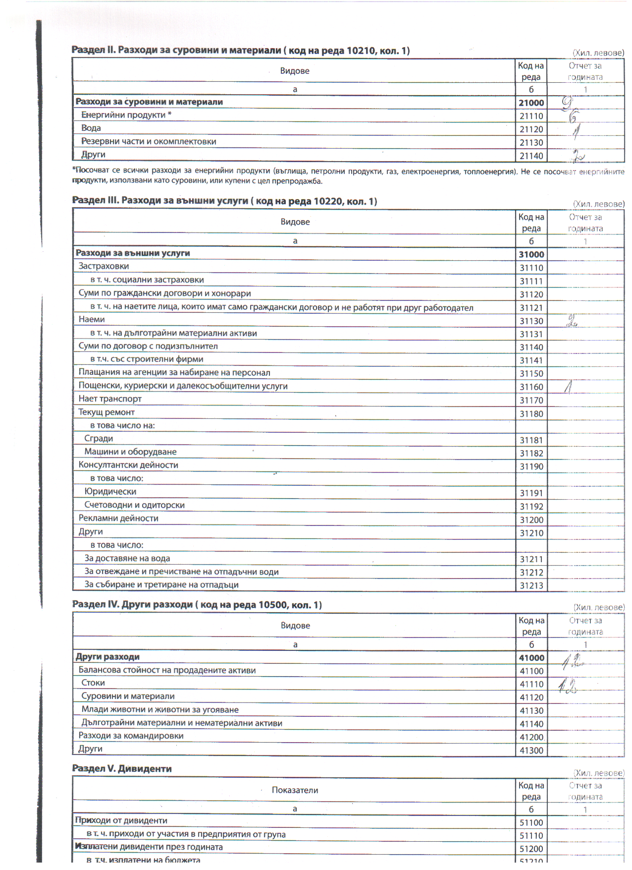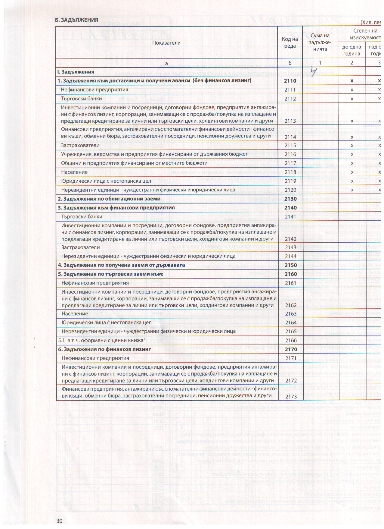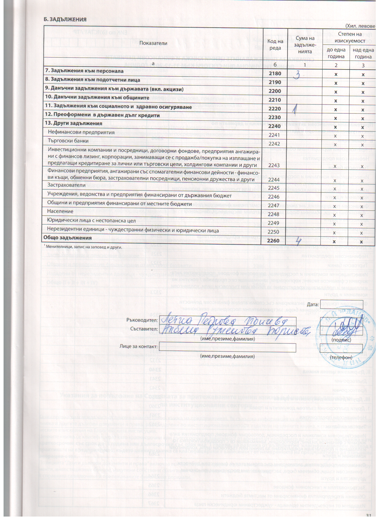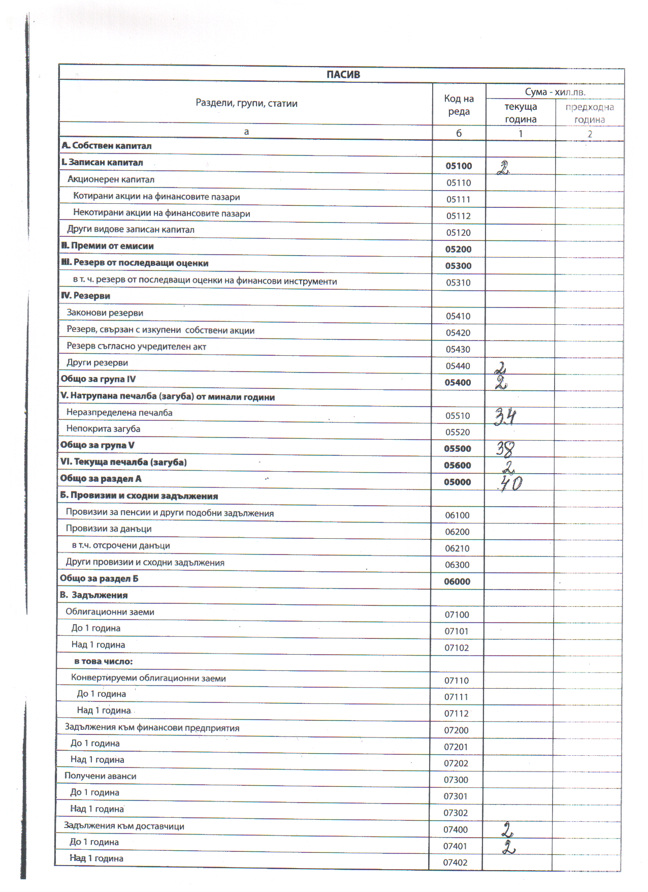 Счетоводен баланс-стр.1, стр.2, стр.3,стр.4, стр.5; ОПР-стр.1, стр.2, стр.3, стр.4;ОПП; ОСК;ДМА;Спр. за вземания и задължения-стр.1, стр.2