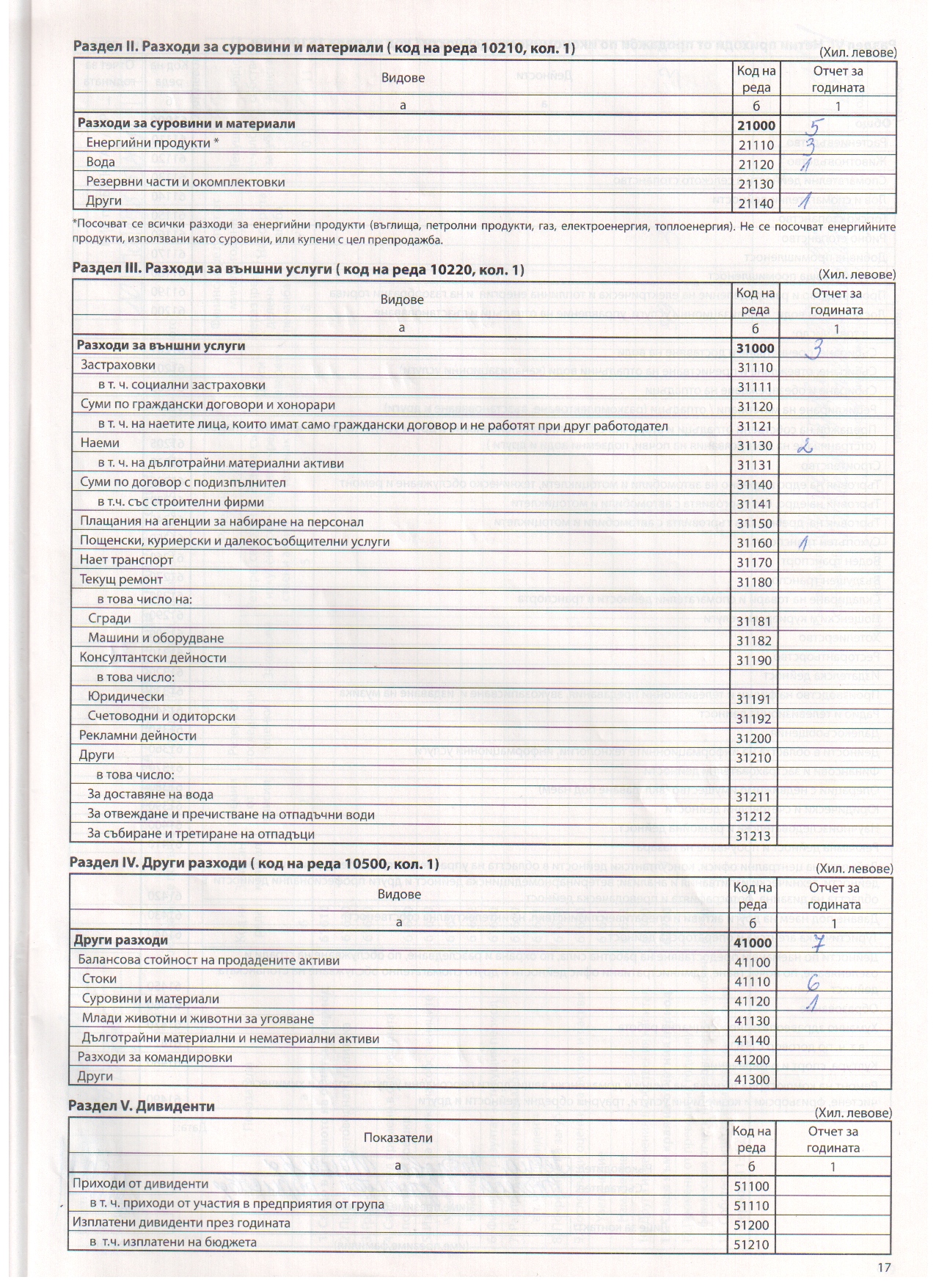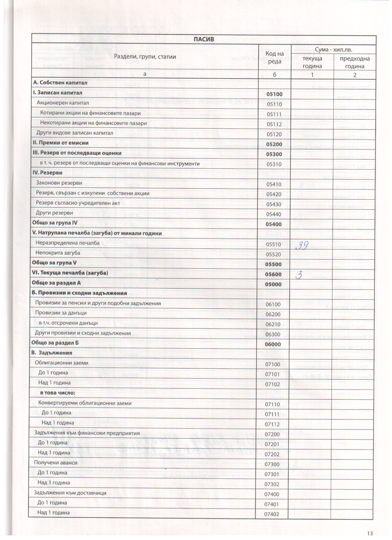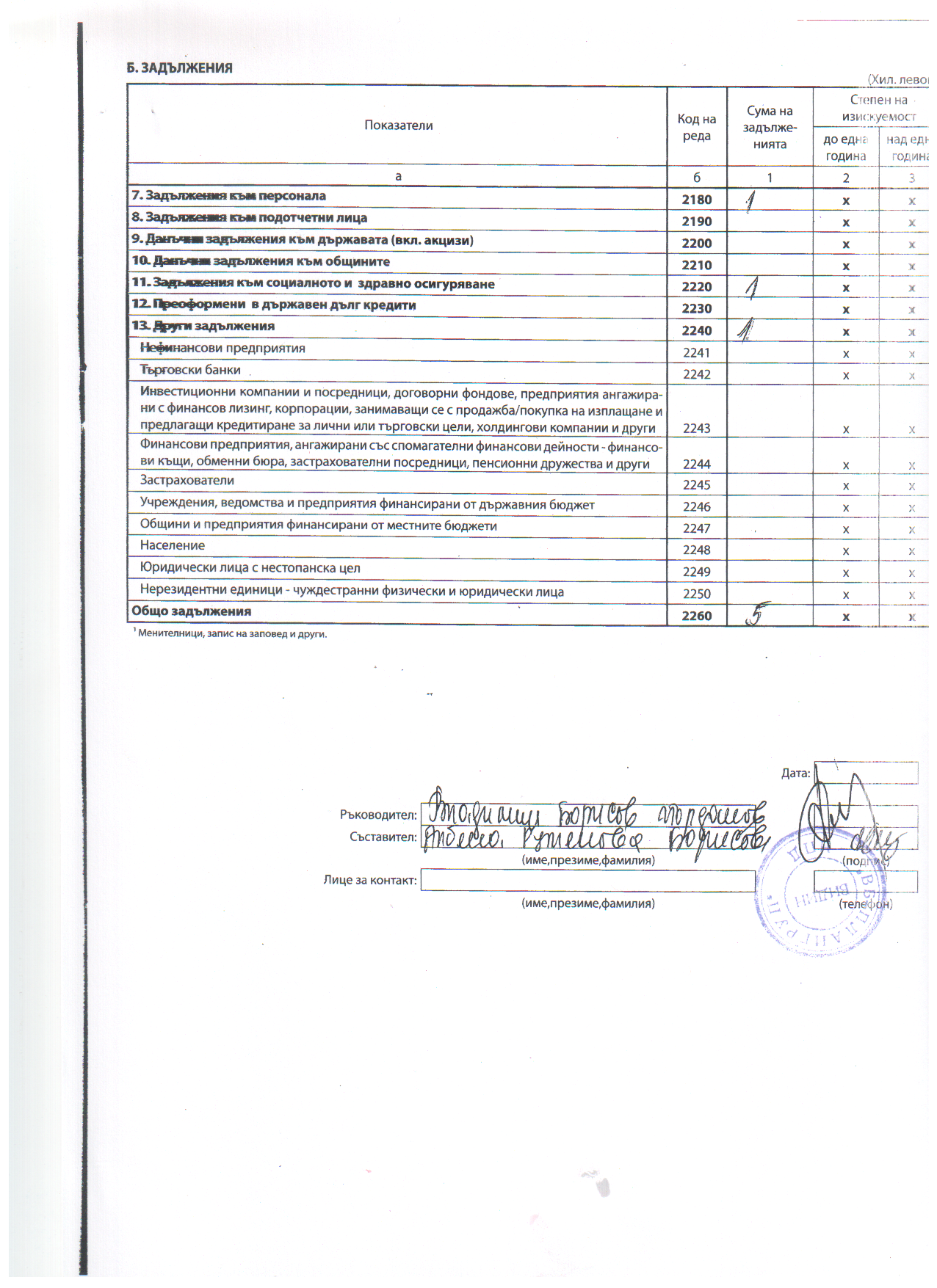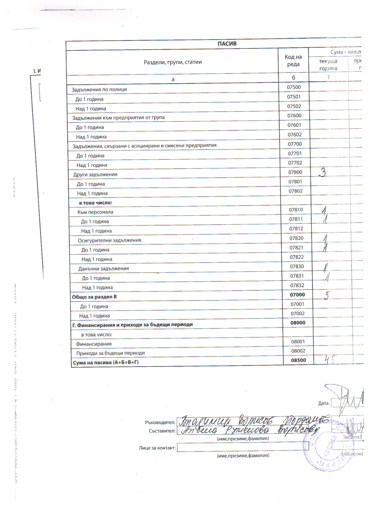 Счетоводен баланс-стр.1, стр.2, стр.3,стр.4, стр.5; ОПР-стр.1, стр.2, стр.3, стр.4;ОПП; ОСК;ДМА;Спр. за вземания и задължения-стр.1, стр.2