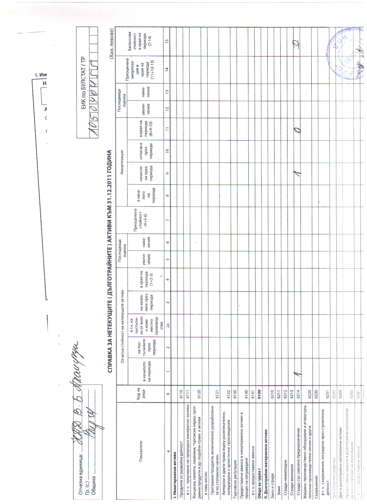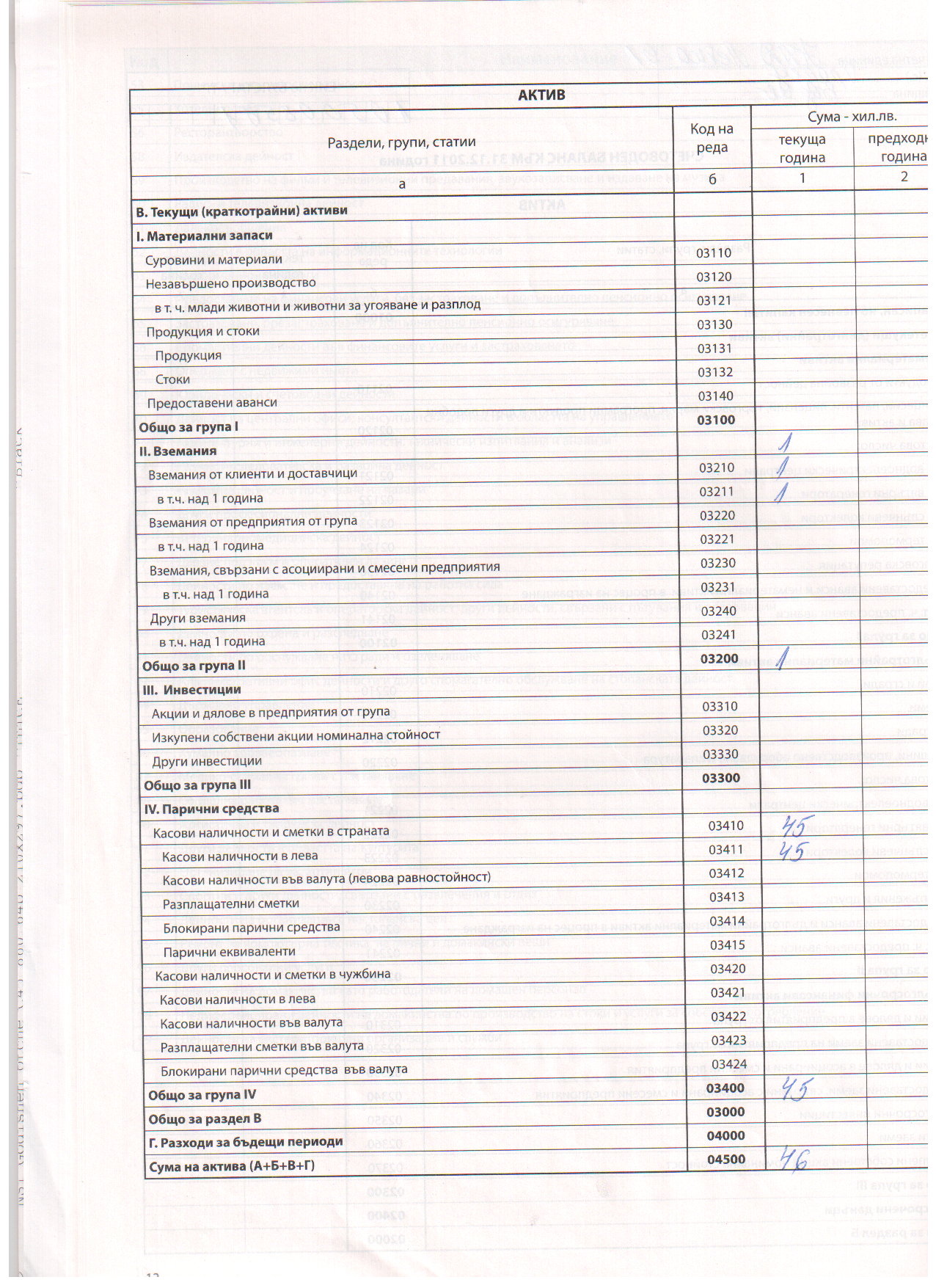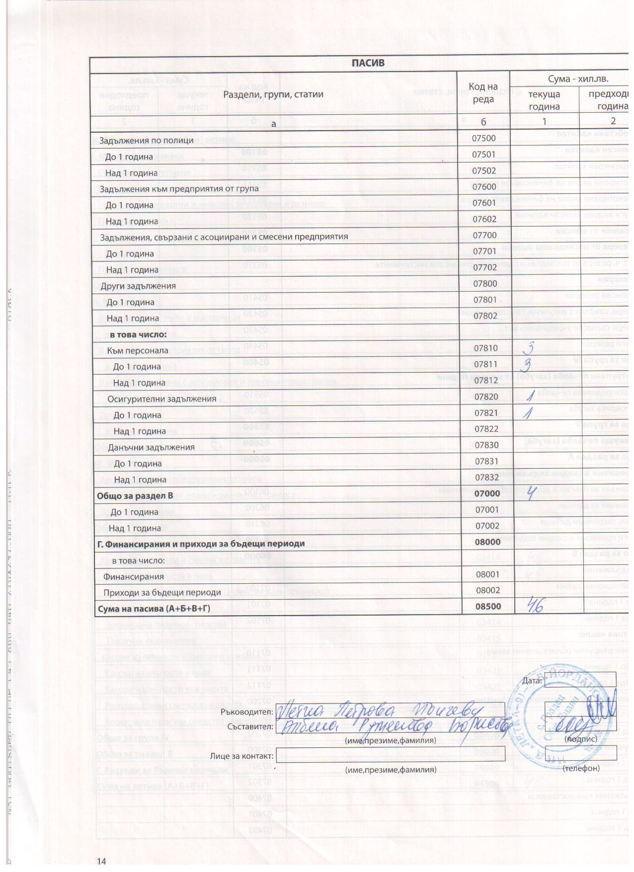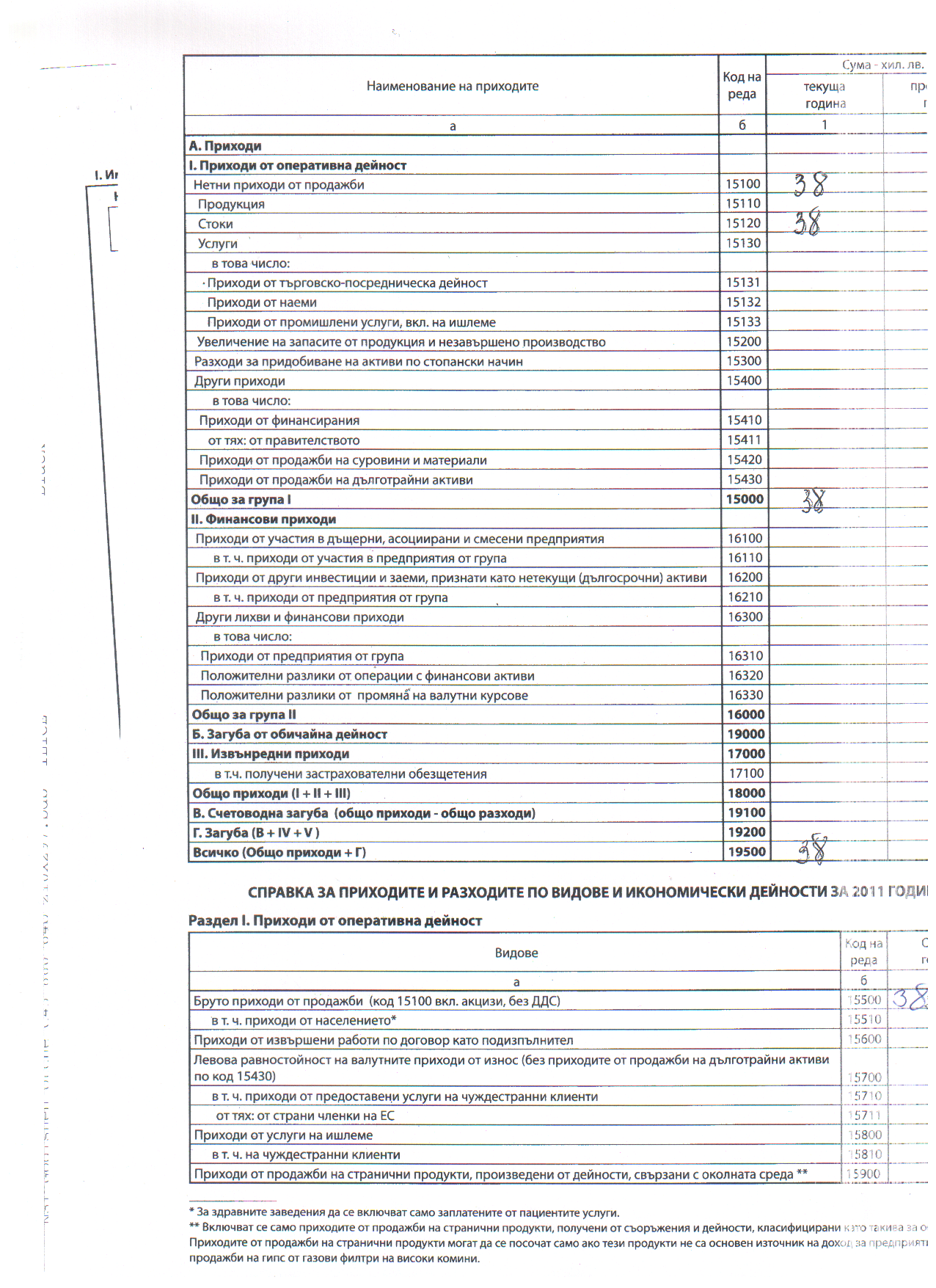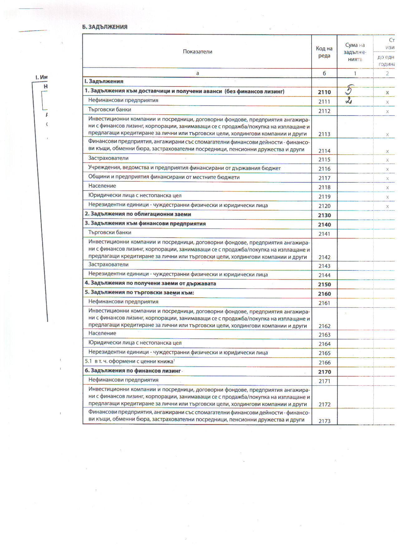 Счетоводен баланс-стр.1, стр.2, стр.3,стр.4, стр.5; ОПР-стр.1, стр.2, стр.3, стр.4;ОПП; ОСК;ДМА;Спр. за вземания и задължения-стр.1, стр.2