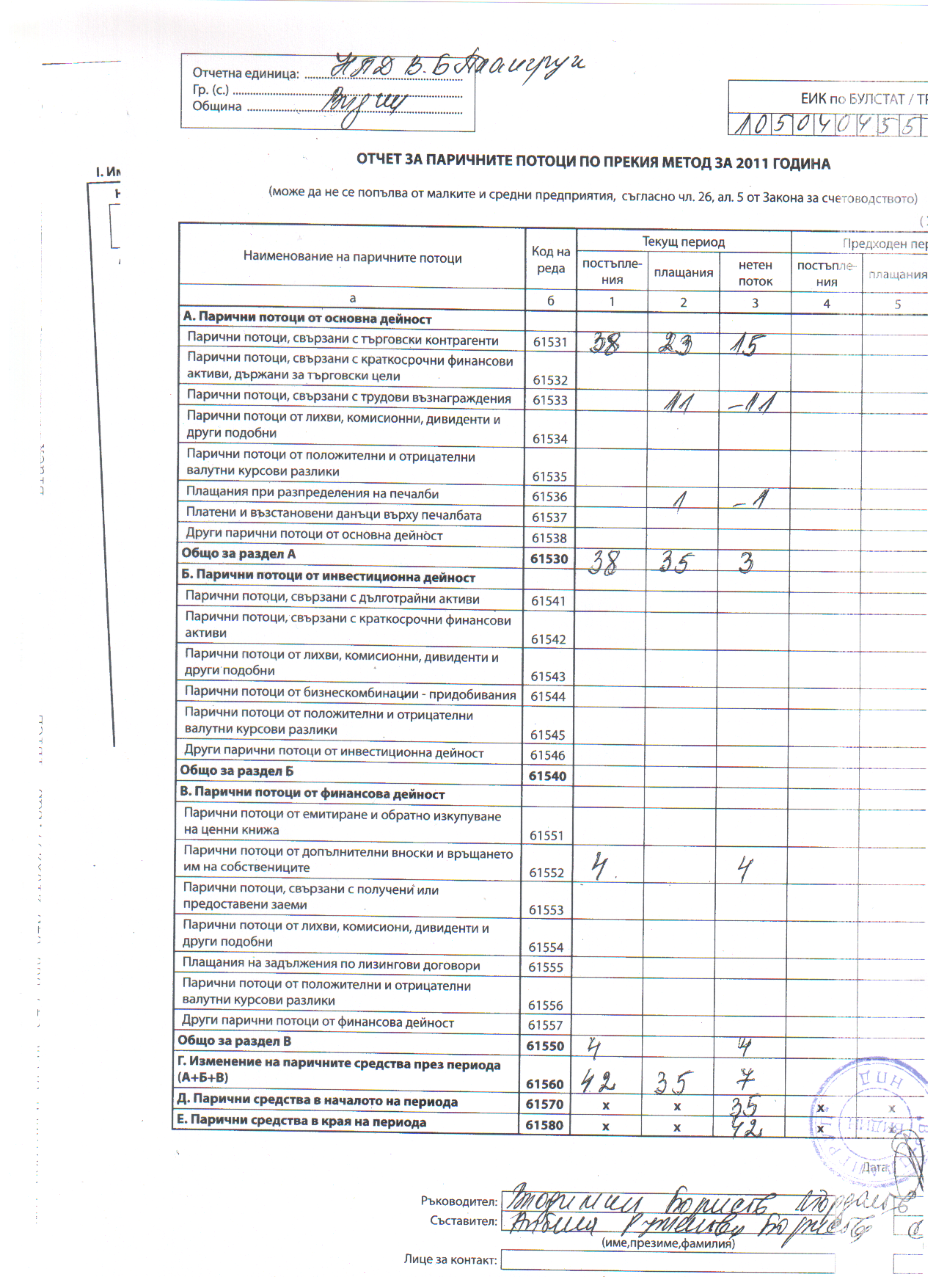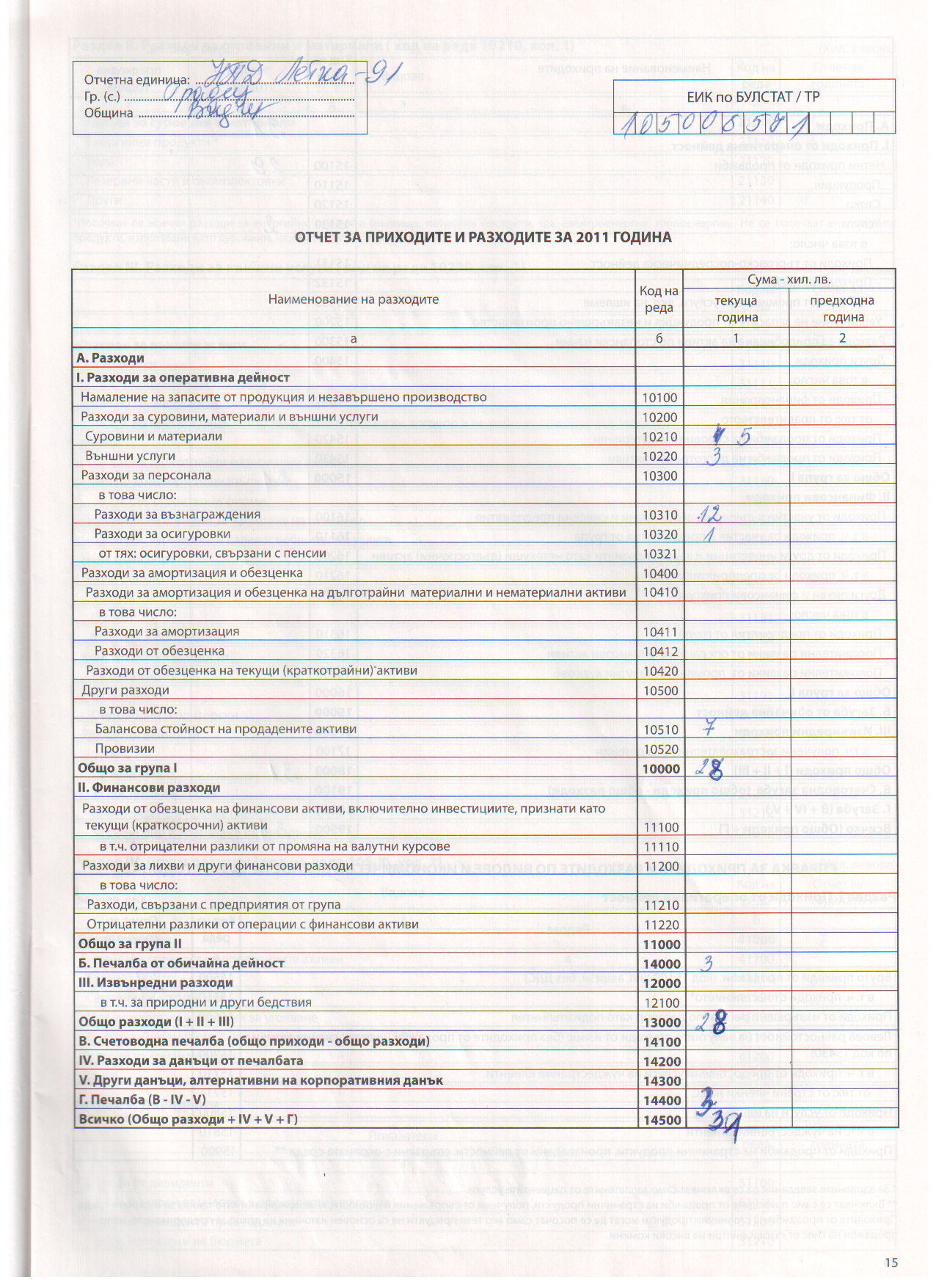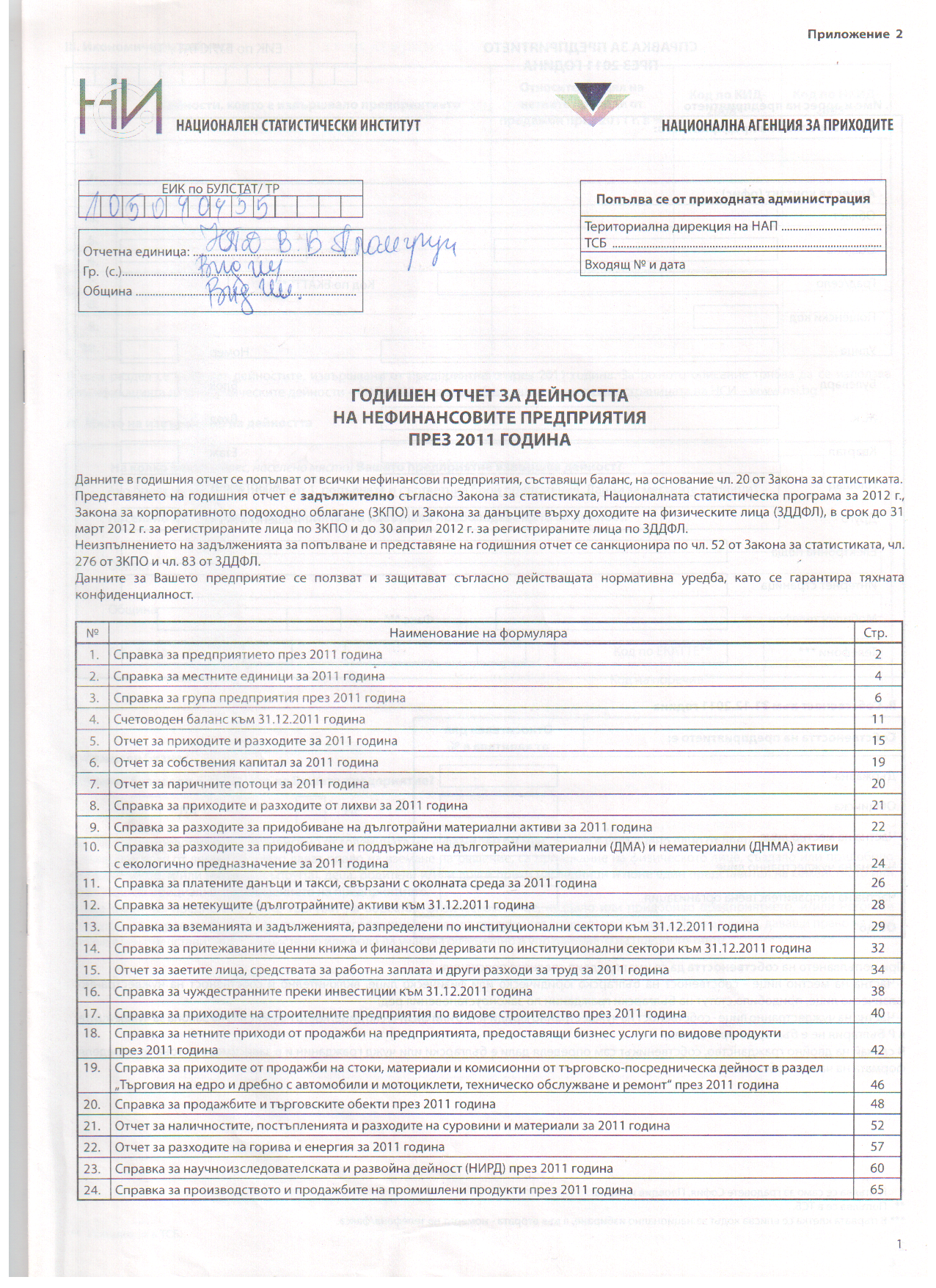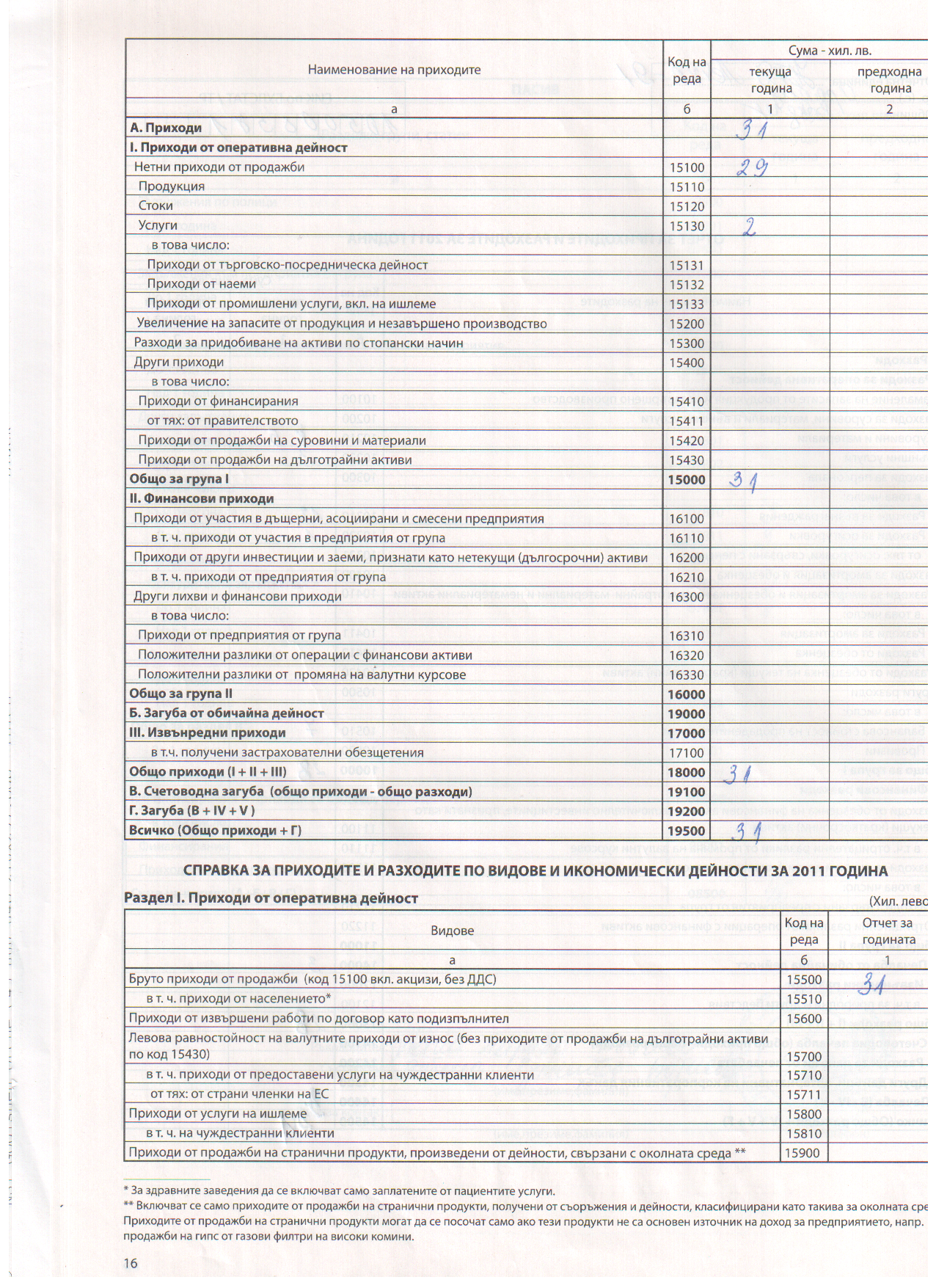 Счетоводен баланс-стр.1, стр.2, стр.3,стр.4, стр.5; ОПР-стр.1, стр.2, стр.3, стр.4;ОПП; ОСК;ДМА;Спр. за вземания и задължения-стр.1, стр.2