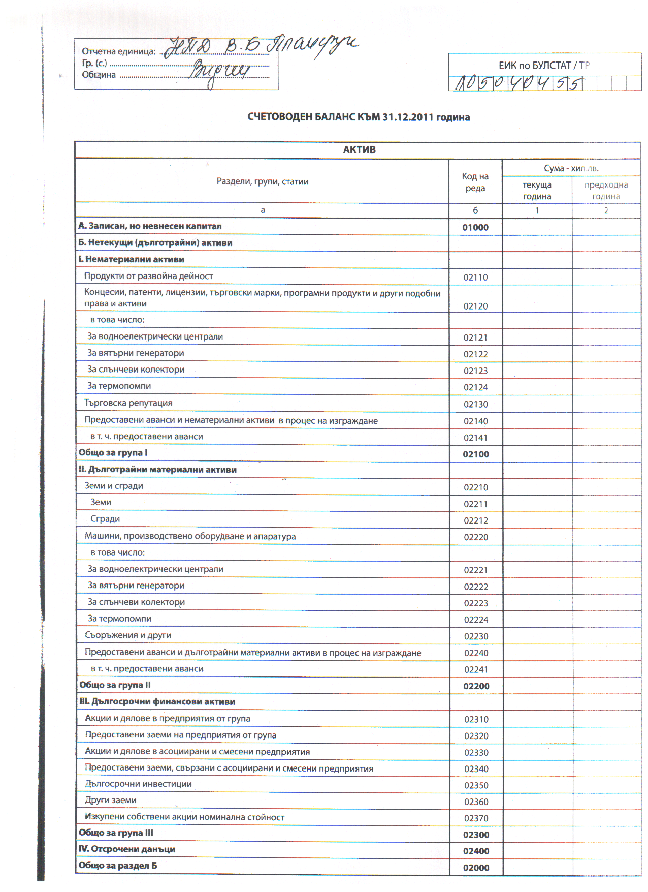 "ХИДРОИНСТАЛСТРОЙ" ДЗЗД; ЕИК/Булстат 175980473; седалище и адрес на управление - гр. Стара Загора, ж.к. "Железник", ул. "Загорка" 15, ап. 9; представляващ - Николай Любчев Иванов; съставител на отчетите - Катя Ангелова Динева; тел. за връзка 0895459468