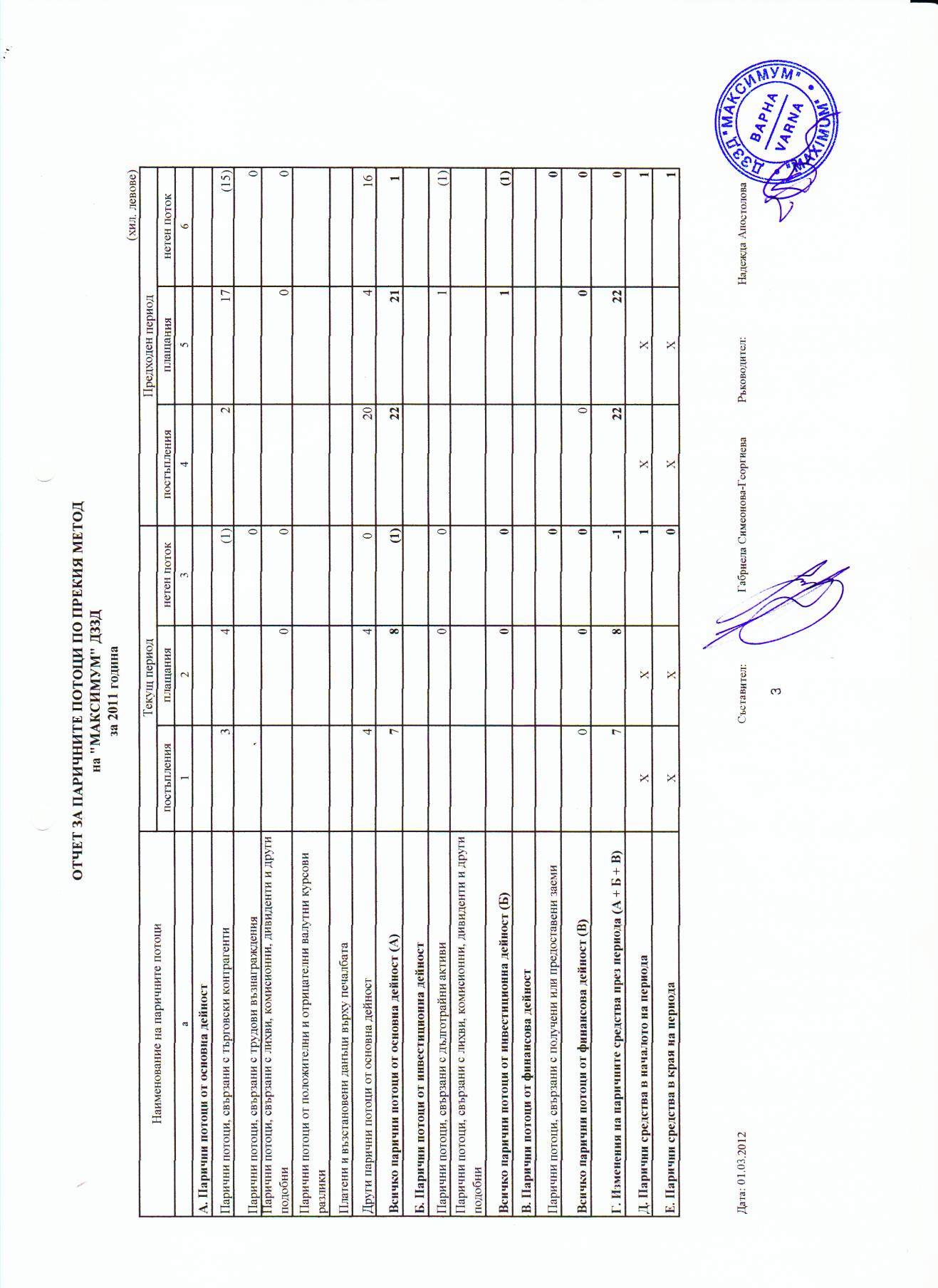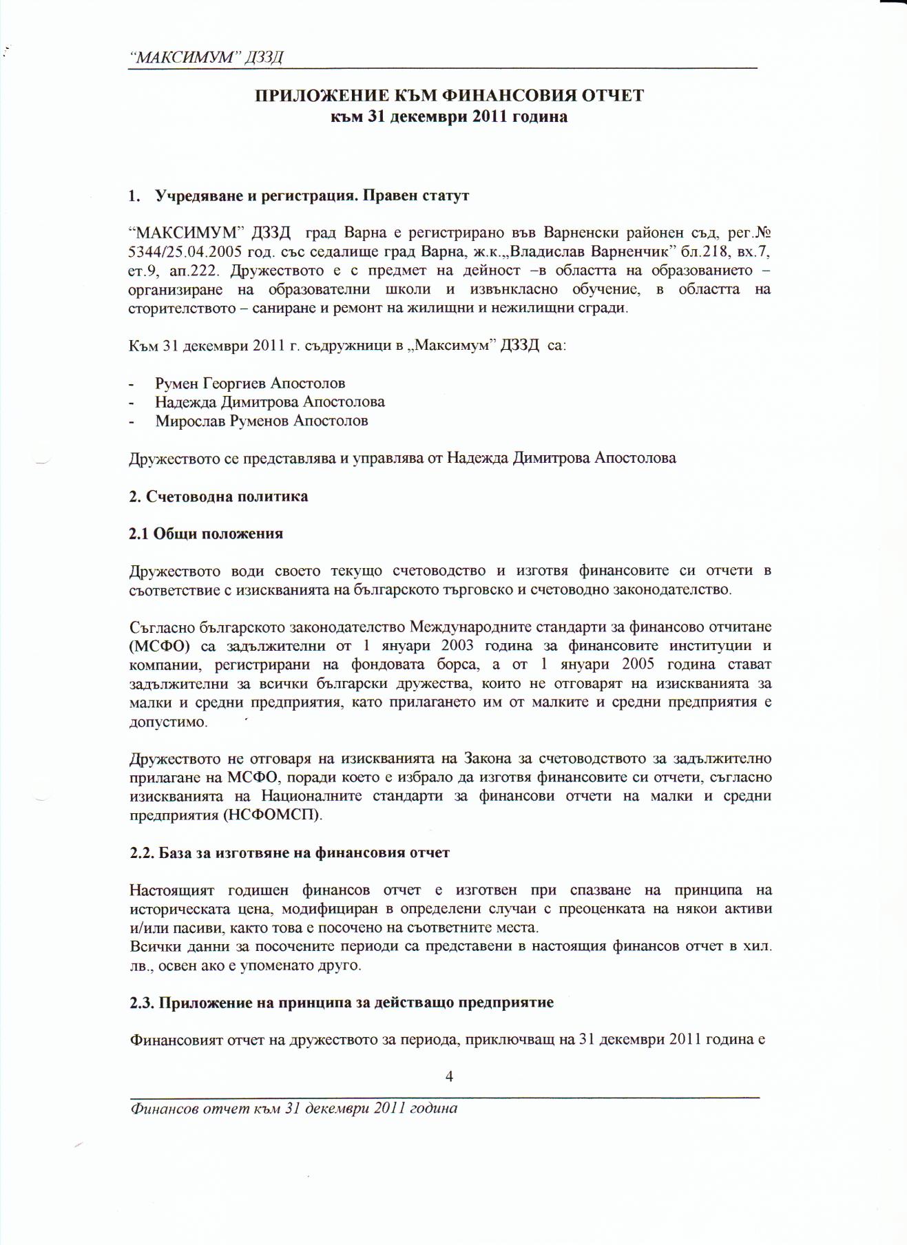 "МАКСИМУМ" ДЗЗД; ЕИК/Булстат 130598160; седалище и адрес на управление - гр. Варна, ж.к. "Владислав Варненчик", бл. 218, вх. 7, ет. 9, ап. 222; представляващ - Надежда Димитрова Апостолова; съставител на отчетите - Габриела Иванова Симеонова-Георгиева