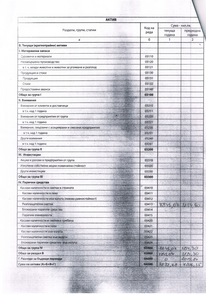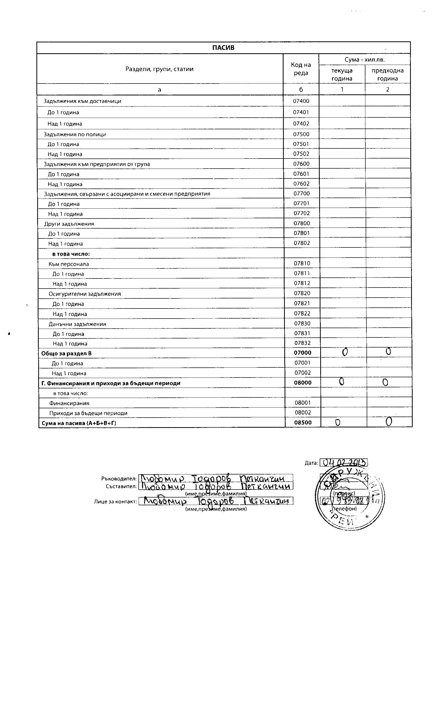"ВАЛЕНТИ" ДЗЗД; ЕИК/БУЛСТАТ 175868289; седалище и адрес на управление - с. Звездица, ул. "Сатурн" 3; представляващ - Анна Атанасова; съставител на отчетите - Зорница Петрова