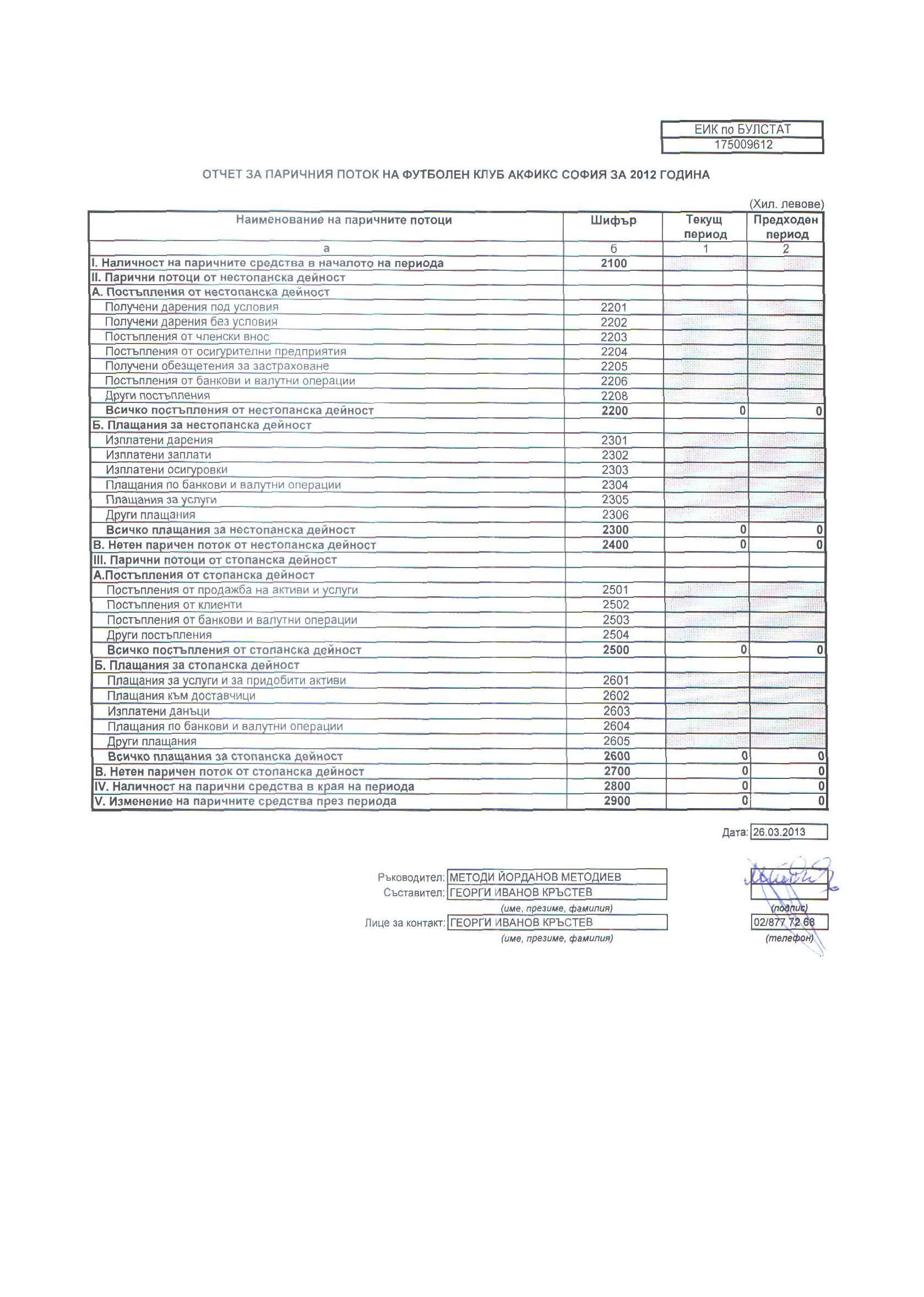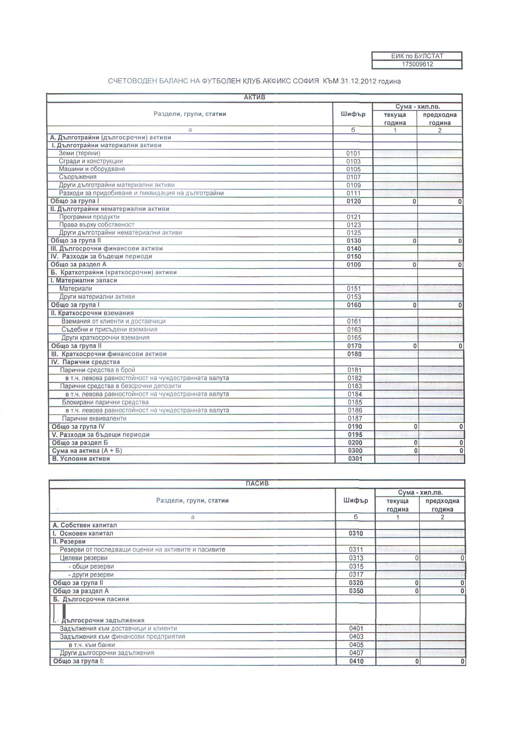 ГФО на СДРУЖЕНИЕ ФУТБОЛЕН КЛУБ АКФИКС СОФИЯ за 2012 г.