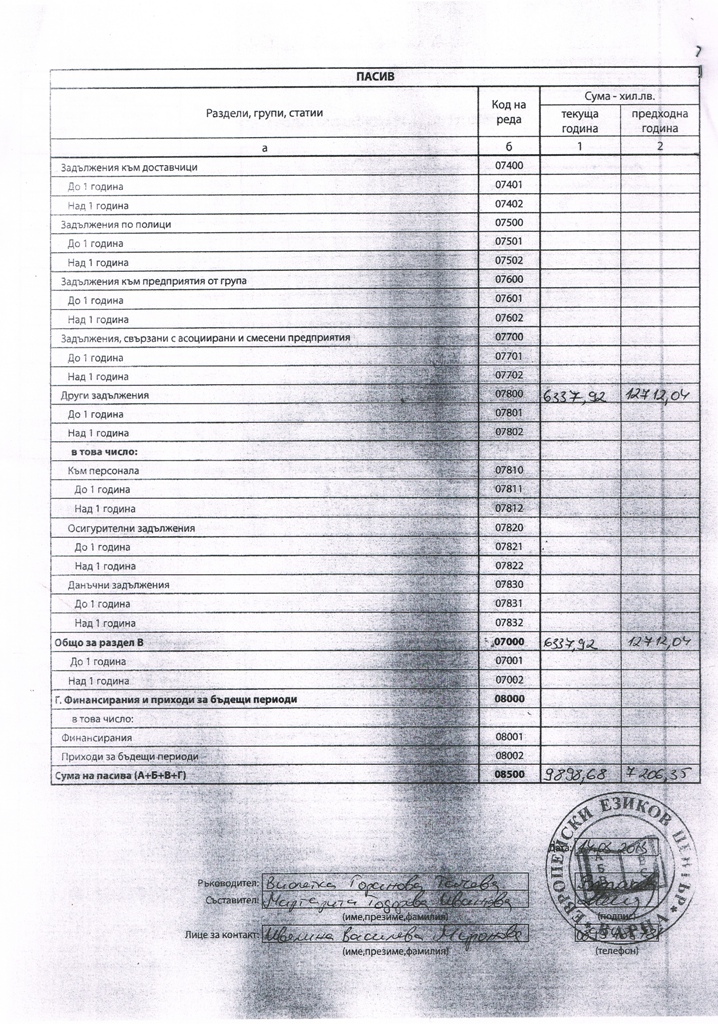 СДРУЖЕНИЕ "ЕВРОПЕЙСКИ ЕЗИКОВ ЦЕНТЪР ВАРНА"; ЕИК/Булстат 176103395; седалище и адрес на управление - гр. Варна, ул. "Проф. Марин Дринов" 55, представляващ - Виолетка Горанова Тачева; съставител на отчетите - Маргарита Тодорова Иванова