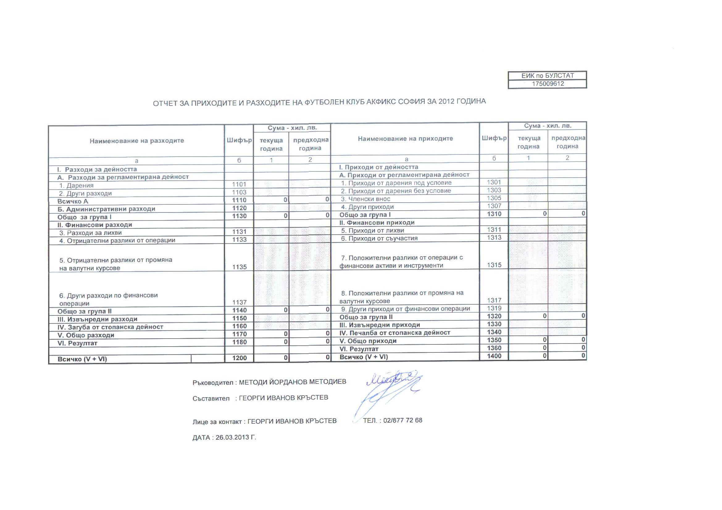 СДРУЖЕНИЕ ФУТБОЛЕН КЛУБ АКФИКС СОФИЯ; ЕИК/БУЛСТАТ 175009612; седалище и адрес на управление - гр. София, бул. "Ботевградско шосе" 44; представляващ - Методи Йорданов Методиев; съставител на отчетите - Георги Иванов Кръстев