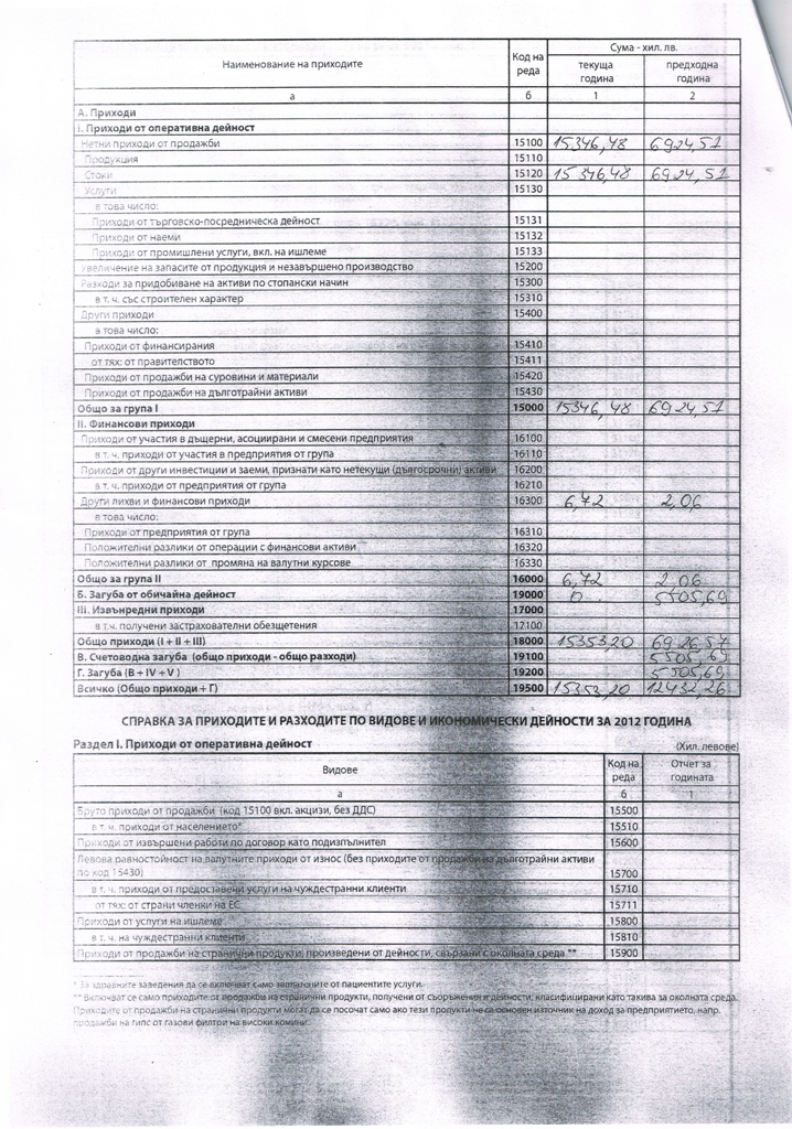 ГФО на "ТОНЧЕВ - ДИМИТЪР ТОНЧЕВ" ЕТ за 2012 г.