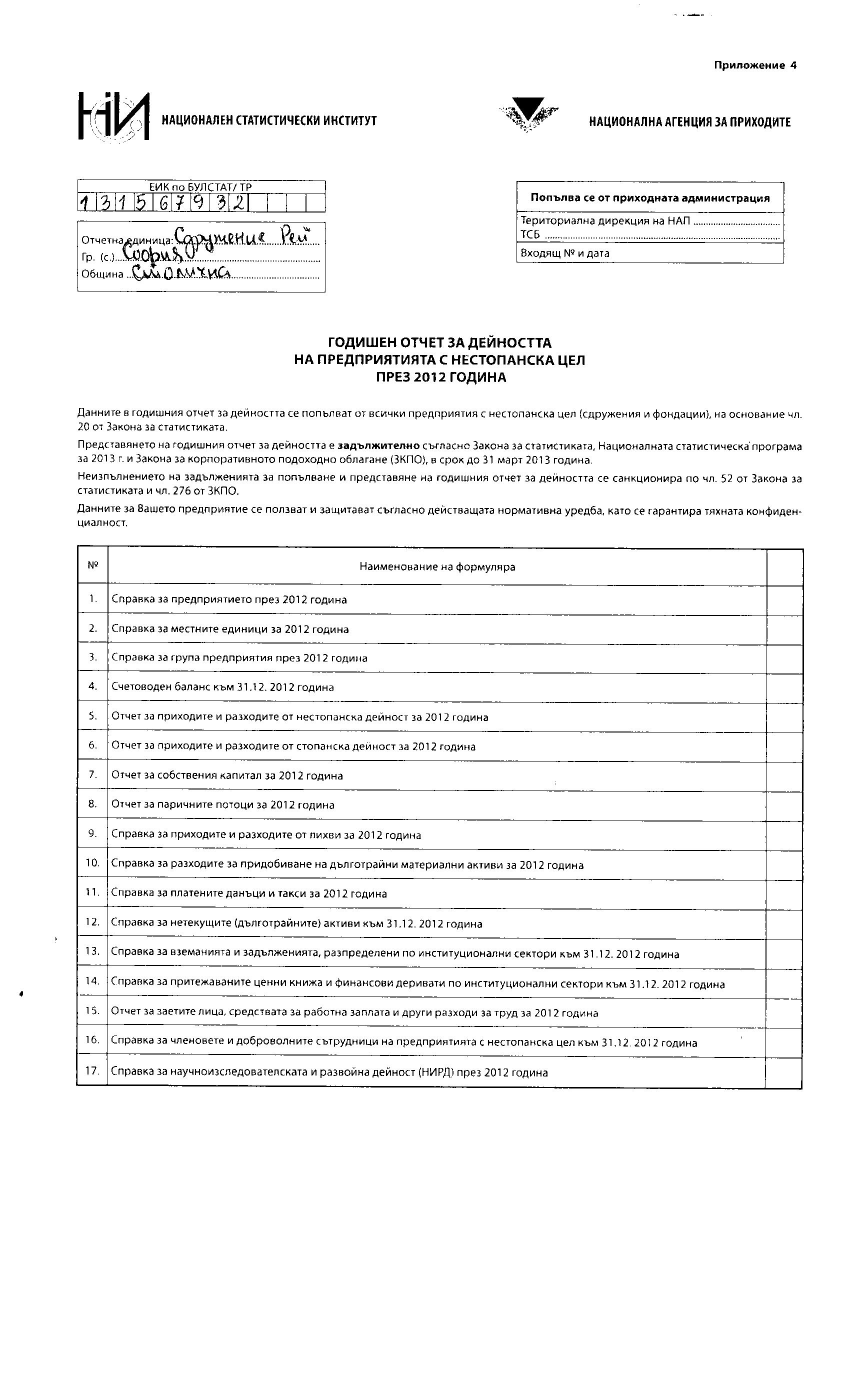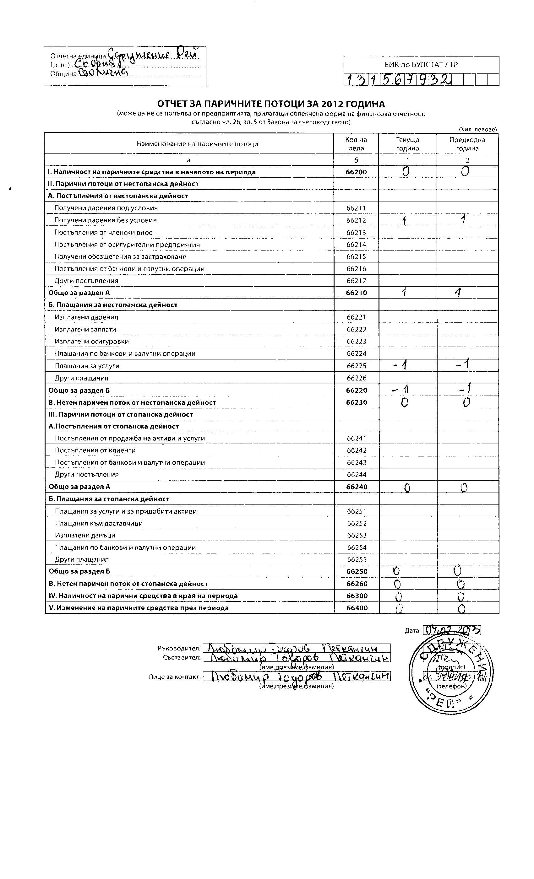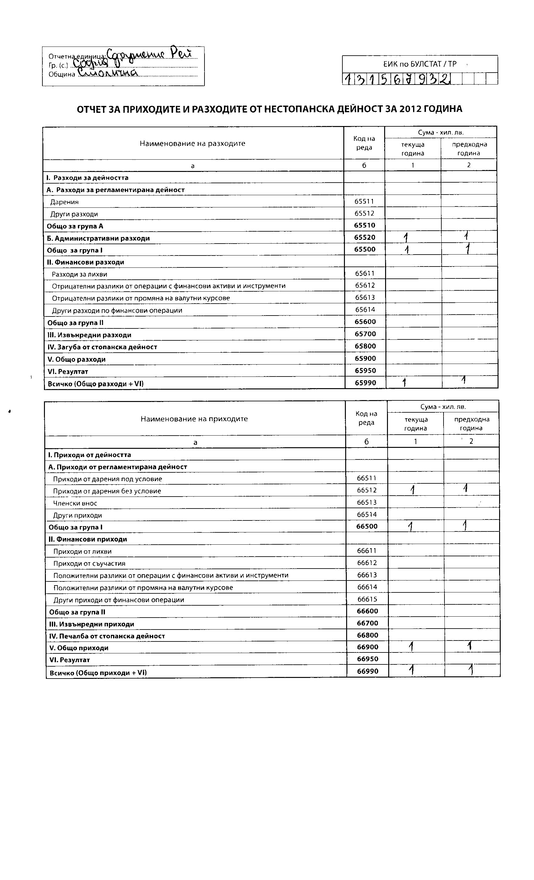 СДРУЖЕНИЕ РЕЙ; ЕИК/БУЛСТАТ 131567932; седавлище и адрес на управление - гр. София, ул. "Бачо Киро" 46; представляващ - Любомир Тодоров Петканчин; съставител на отчетите - Любомир Тодоров Петканчин
