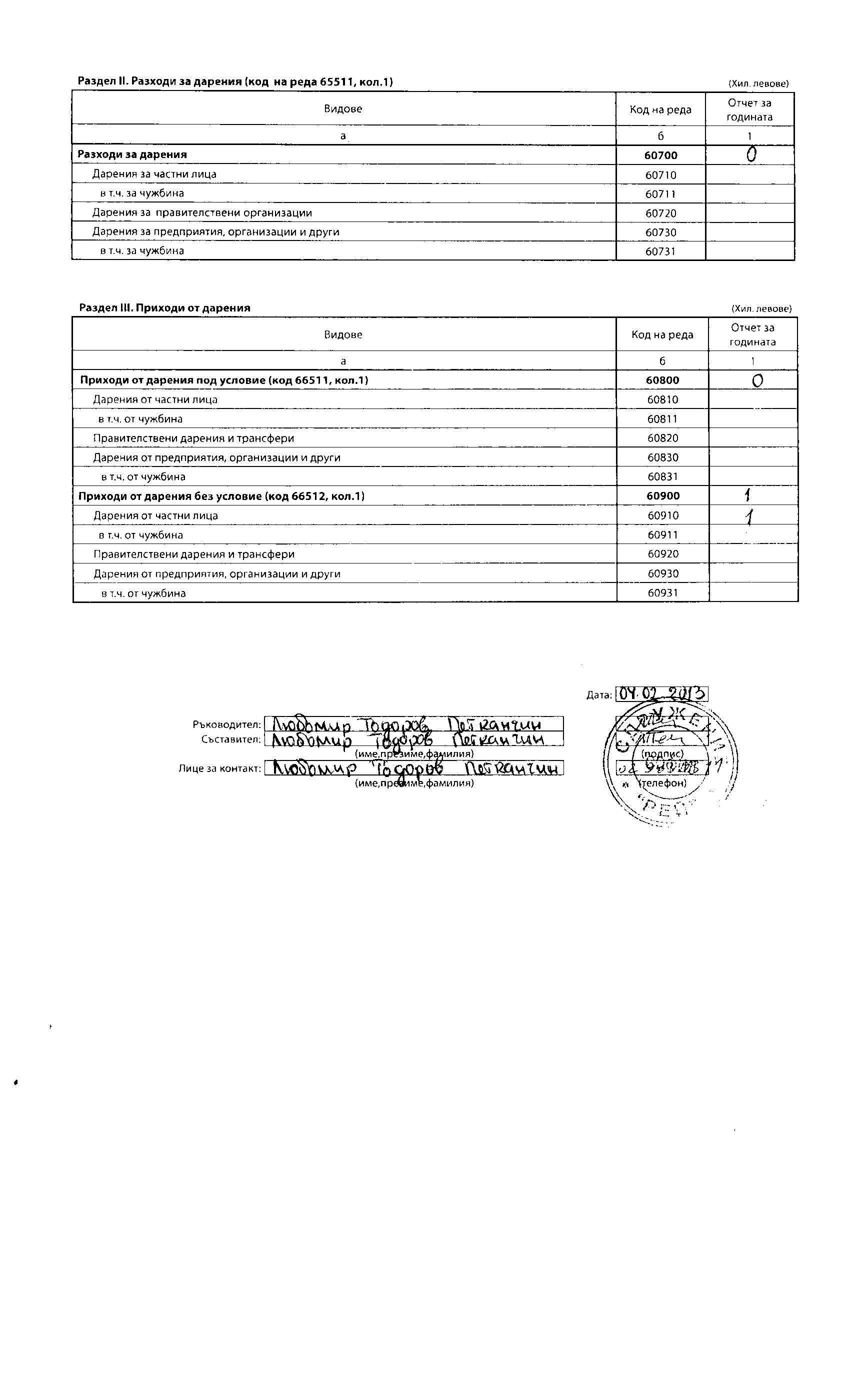 АСОЦИАЦИЯ "БОЛКАН ДИНАМИКС"; ЕИК/БУЛСТАТ 126748824; седалище и адрес на управление - гр. София 1574, ж.к. "Христо Смирненски" бл. 68, вх. Г; представляващ - Борис Рачев; съставител на отчетите - Жанин Тодорова