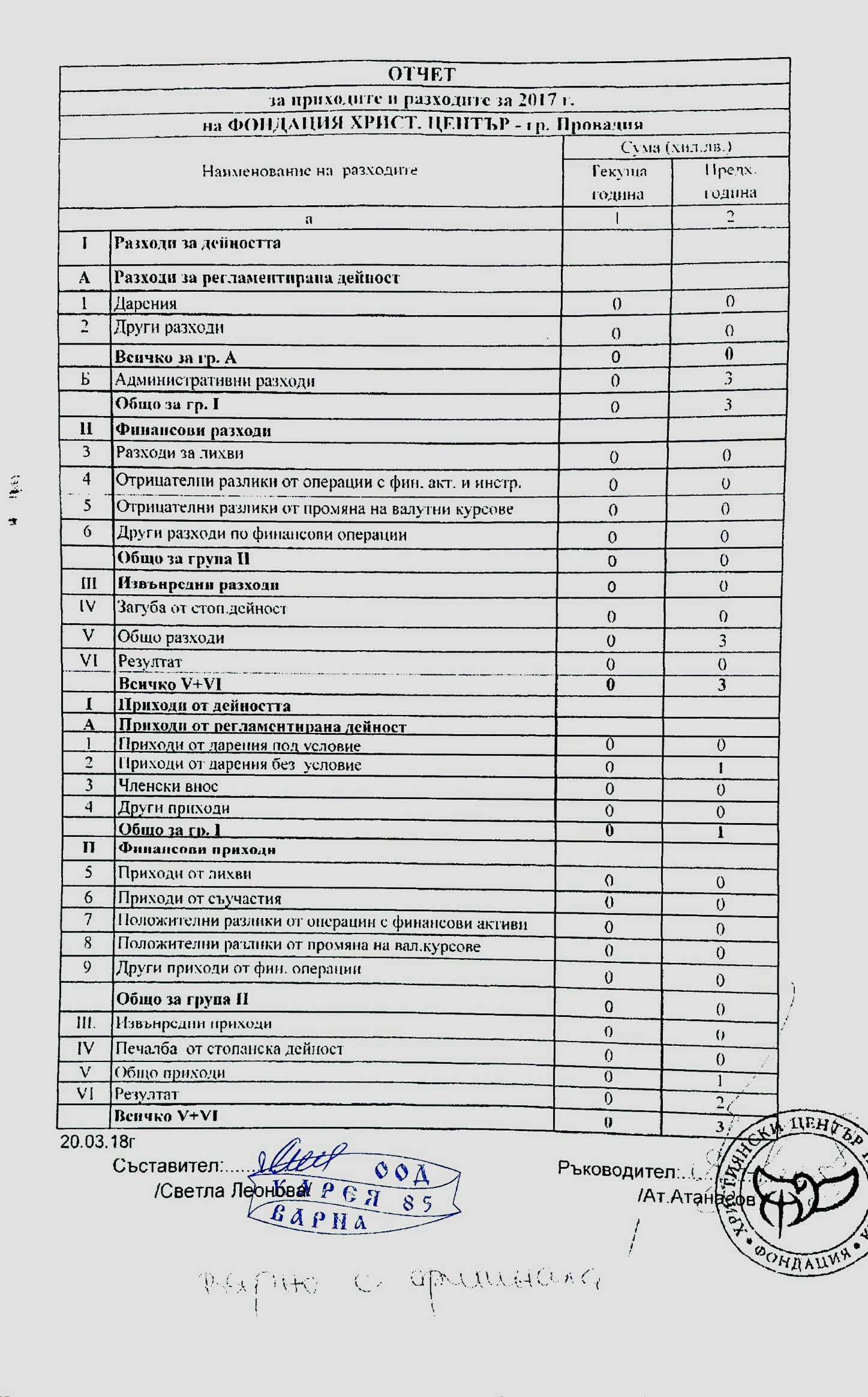 ГФО на "ФОНДАЦИЯ ХРИСТИЯНСКИ ЦЕНТЪР ПРОВАДИЯ" за 2017 г.